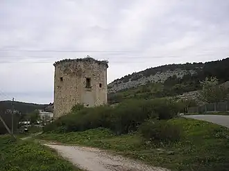 Двенадцатигранная каменная башня, памятник архитектуры республиканского значения[83], (сохранившаяся высота 12 м, диаметр — 12,5-14 м), сложенная из бута на известковом растворе[84], расположена в центре села, у автобусной остановки. Башня трёхэтажная, изнутри — круглая, толщина стен — от 1,5 до 2 метров, углы башни перевязаны штучным инкерманским камнем[84]. На первом этаже — цистерна для воды, верхние два — жилые, второй этаж перекрыт стрельчатым сводом[85], стрельчатые узкие окна[83].