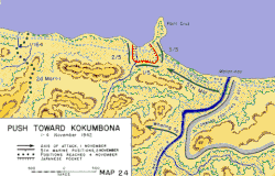 Американцы снова перешли Матаникау и снова провели наступление на запад начиная с 18 ноября, но не смогли противостоять сопротивлению японских войск. Американское наступление было остановлено 23 ноября на линии чуть западнее мыса Крус. Американцы и японцы находились на своих позициях лицом к лицу в течение последующих шести недель, когда, на завершающих этапах кампании американские войска начали своё последнее, заключительное наступление, завершившееся эвакуацией японских войск. Несмотря на то, что американцы были близки к захвату позиций японского арьергарда в начале ноября, этого не произошло до финальных стадий кампании, когда американские войска вошли в Кокумбону.[37]