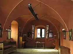 На первом, отреставрированном, этаже крепости — шесть комнат и зал с большим вестибюлем. Теперь здесь расположены экспозиции кельтской и скифской культур, а также портреты всех владельцев замка. Второй этаж похож по планировке — шесть маленьких комнат, большой зал и длинный коридор. Также в замке есть несколько «тайных переходов» — двойных стен, которые хозяева с радостью показывают посетителям.