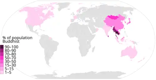 Большинство буддистов (87 % или 408 млн) проживают в Азии. За пределами этой части света значительное число буддистов можно встретить в Северной Америке (3,7 млн) и Европе (1,7 млн). На других частях света численность буддистов невелика: в Латинской Америке их 672 тыс., в Океании — 448 тыс., в Африке — 247 тыс.[7]
