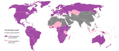 Христиане составляют большинство населения Европы, Северной и Латинской Америк, Океании. В Африке доля христиан достигла 47,9 %; в Азии последователи Христа составляют лишь 8,5 % населения (278 млн верующих)[7].