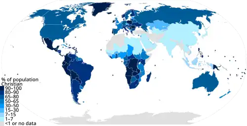 Христианство является самой распространённой религией мира и единственной религией, чьи приверженцы живут во всех 232 странах мира[14] (по методологии «Всемирной христианской энциклопедии» (2000) и «Энциклопедии религий мира» (2004) — во всех 238 странах мира[15][2]). На начало XXI века лишь в 116 городах мира (с населением более 50 тыс.) не было ни одной действующей христианской церкви[16]. В 2015 году в мире насчитывалось свыше 4,3 млн христианских поместных церквей и мест богослужения[13]. Ежегодно число церквей увеличивается на 50 тыс.[17] Христианские богослужения посещают 1,5 млрд человек[18], в том числе 600 млн — еженедельно[19].