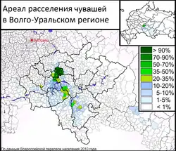 Чува́ши (самоназвание — чув. чӑвашсе́м, ед. ч. чӑва́ш) — тюркский народ[36] численностью в мире в 1 111 600 (2023)[37] человек, из них в России — 1 067 139 (согласно результатам переписи 2021 года). В Чувашской Республике проживает больше половины всех чувашей, живущих в России, остальные проживают почти во всех регионах России, а небольшая часть — за её пределами, наибольшие группы в Казахстане, Узбекистане и Украине.