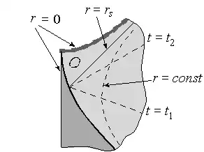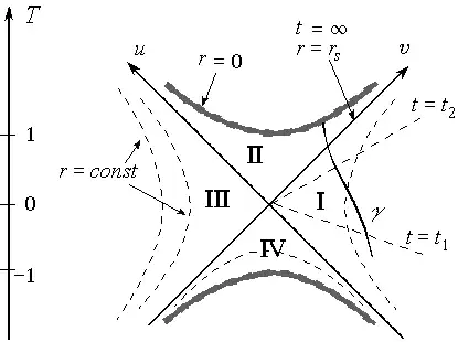 где а функция определяется (неявно) уравнением Пространство максимально, то есть его уже нельзя изометрически вложить в большее пространство-время (его нельзя «продолжить»). Исходное пространство является всего лишь частью при — область I на рисунке. Тело, движущееся медленнее света — мировая линия такого тела будет кривой с углом наклона к вертикали меньше 45°, см. кривую на рисунке — может покинуть При этом оно попадает в область II, где Покинуть эту область и вернуться к оно, как видно из рисунка, уже не сможет (для этого пришлось бы отклониться более, чем на 45° от вертикали, то есть превысить скорость света). Область II, таким образом, представляет собой чёрную дыру. Её граница (ломаная, ) соответственно является горизонтом событий.