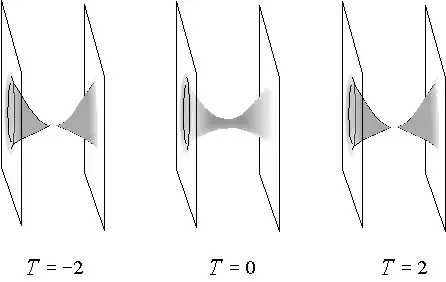 Чтобы представить себе структуру 4-мерного пространства-времени его удобно условно рассматривать как эволюцию 3-мерного пространства. Для этого можно ввести «временну́ю» координату и сечения (это пространственно-подобные поверхности, или «поверхности одновременности») воспринимать как «в данный момент времени». На рис. 2 показаны такие сечения для разных моментов . Мы видим, что вначале имеются два несвязанных 3-мерных пространства. Каждое из них сферически симметрично и асимптотически плоско. Точка отсутствует и при кривизна неограниченно растёт (сингулярность). В момент времени обе сингулярности исчезают и между ранее не связанными пространствами возникает «перемычка» (в современной терминологии кротовая нора). Радиус её горловины возрастает до при затем начинает уменьшаться и при перемычка снова разрывается, оставляя два пространства несвязанными[25].