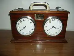 - Часы, на которых установлен лимит времени для каждого из игроков, располагаются рядом с игровой доской. Часы не запускаются до начала партии (на механических часах обе кнопки находятся в полунажатом состоянии — в таком положении ни один из механизмов не работает).