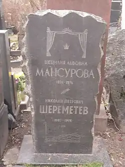 - 1 2 Halida Rojkova. Шереметьев и Мансурова? Красивая история любви графа и актрисы (англ.). www.topauthor.ru. Дата обращения: 12 июня 2019. Архивировано 29 сентября 2018 года.
