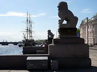 Прибывшие в сентябре 1907 года китайские ши-цза было решено установить на недавно реконструированной Петровской набережной, которая только в 1901—1903 годах была облицована гранитом. Изготовление постаментов и установку скульптур курировал архитектор Л. Н. Бенуа.
