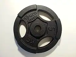 Диски олимпийского стандарта, начиная с веса 10 кг (новый стандарт), 15 кг (старый стандарт) или 25 кг (диски для пауэрлифтинга), имеют внешний диаметр 45 см. Могут быть как обрезиненными, так и без покрытия. Диски без покрытия используются в пауэрлифтинге. Для удобства, диски разных весов окрашиваются в разные цвета.