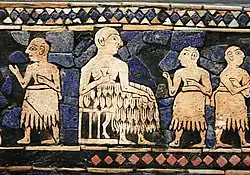 На престоле шумерский царь Ура, возможно Ур-Пабилсаг, с ожидающим персоналом. Штандарт войны и мира, ок. 2600 года до н. э.