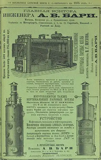 Летом 1877 года инженер А. В. Бари с семьёй вернулся в Россию и, воспользовавшись своими знакомствами, начал сотрудничество с Людвигом Нобелем. В том же году Л. Нобель приступил к постройке задуманного им в 1876 г. нефтепровода от мест добычи в Балаханах до своего нефтеперегонного завода в Чёрном городе (заводской район Баку).[26] По поручению Л. Нобеля Бари отправляется в США для сбора информации об устройстве американских нефтяных месторождений и найма специалистов[27].Л. Нобель с большими сложностями договаривается о землеотводе, покупает землю, заказывает в США и Англии необходимые для постройки нефтепровода материалы и оборудование и после их прибытия начинается строительство. Владельцы гужевых повозок, перевозивших нефть, неоднократно поджигали и разрушали строящуюся магистраль и для охраны по всей её длине были поставлены караульные будки. Нефтепровод был введён в эксплуатацию осенью 1878 года. До конца года по нему было перекачено 841 150 пудов (около 13 779 тонн) нефти, а в течение 1879 года — 5 585 324 пуда (91 487 тонн)[28], стоимость перевозки одного пуда снизилась до 9 раз и строительство полностью окупило себя за один год.