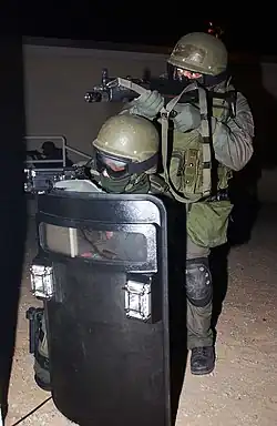 - «тактические щиты» (лёгкие одноручные щиты массой от 6,4 до 8 кг, сравнительно небольших размеров, которые могут использовать бойцы штурмовых групп; они обеспечивают защиту от осколков, ружейной дроби, картечи и пистолетных пуль калибра 9×19 мм или .45 ACP)[15]; в качестве примера, можно привести советский БЗТ-75 (трапециевидный одноручный щит из титанового сплава, массой 5,5 кг и площадью 21,2 дм²);
