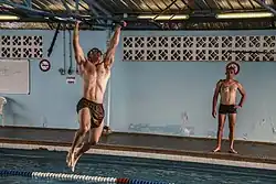 Оригинальный текст (англ.)With regard to the development of virile qualities, this is obtained by the execution of certain difficult or dangerous exercises requiring the development of these various qualities, for example while seeking to control the fear of falling, of jumping, of rising, of plunging, of walking on an unstable surface, etc.