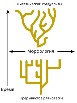 В 1972 году палеонтологами Нильсом Элдриджем и Стивеном Гулдом была предложена теория прерывистого равновесия, утверждающая, что эволюция существ, размножающихся половым путём, происходит скачками, перемежающимися с длительными периодами, в которых не происходит существенных изменений. Согласно этой теории, фенотипическая эволюция, эволюция свойств, закодированных в геноме, происходит в результате редких периодов образования новых видов (кладогенез), которые протекают относительно быстро по сравнению с периодами устойчивого существования видов. Теория стала своеобразным возрождением сальтационной концепции. Принято противопоставлять теорию прерывистого равновесия теории филетического градуализма, которая утверждает, что бо́льшая часть процессов эволюции протекает равномерно, в результате постепенной трансформации видов.