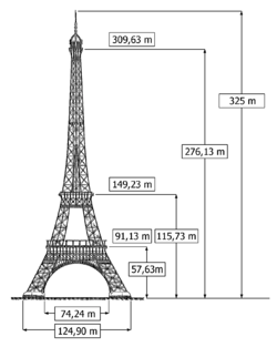 Первоначально Эйфелева башня возвышалась на 300,65 м над уровнем земли. Высота вместе с новой антенной составляет 330 метров (2022 год)[4].