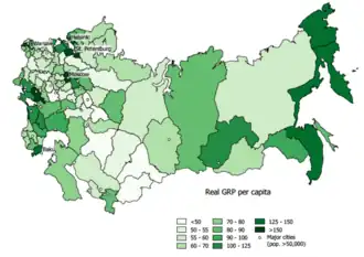 Среди регионов Российской империи присутствовала большая неравномерность экономического развития. Выпуск на душу населения в 1897 году в богатейшем регионе империи (Санкт-Петербург) было равно примерно 4873 международных долларов 1990 года, почти в 11 раза больше, чем в беднейшем — 453 доллара (Тургайская область). Выпуск на душу населения в двух самых богатых губерниях, Санкт-Петербургской и Московской, были на уровне самых развитых стран Европы.[83]