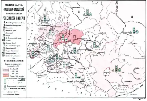 Карта фабрично-заводской промышленности Российской империи. По книге «Фабрично-заводская промышленность и торговля России» под ред. Д. И. Менделеева (1893)