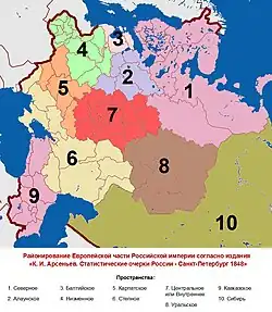 Первые опыты по экономическому районированию территории Российской империи относятся к работам Василия Никитича Татищева (начало XVIII века). В качестве научного направления социально-экономической географии экономическое районирование в России существовало с XIX века. В 1818 году К. И. Арсеньев в работе «Начертание статистики Российского государства» (1818) указал «исходя из чисто географических соображений»[2] десять пространств — Северное (включало Финляндию), Алаунское, Балтийское (остзейские губернии), Низменное (в том числе Литва), Карпатское, Степное, Центральное, Уральское, Кавказское и Сибирское.