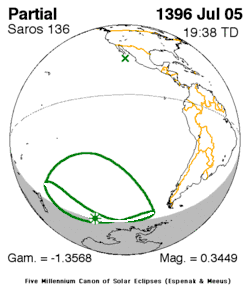 - Полное солнечное затмение 8 июня 1956 года с максимумом в 21:20:09 UT, наблюдавшееся в южной части Тихого океана, и полное солнечное затмение 11 июля 2010 года с максимумом в 19:33:33 UT, которое также наблюдалось в южной части Тихого океана, но уже несколько севернее. В данном случае экселигмос получился на 1 час 47 минут короче, чем 19 756 суток.