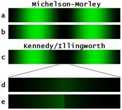 Используя специальную оптическую схему с шагом 1/20 волны в одном зеркале, Рой Дж. Кеннеди (1926) и К. К. Иллингворт (1927) (рис. 8) преобразовал задачу обнаружения смещений полос из относительно нечувствительной задачи оценки их латеральных смещений в значительно более чувствительную задачу регулировки интенсивности света по обеим сторонам резкой границы для равной яркости[16][17]. Если они наблюдали неодинаковую освещённость по обе стороны от ступени, как на рис. 8е, они добавляли или удаляли калиброванные гири из интерферометра до тех пор, пока обе стороны ступеньки снова не были равномерно освещены, как на рис. 8д. Количество добавленных или удалённых грузов служило мерой сдвига полос. Разные наблюдатели могли обнаружить изменения всего от 1/300 до 1/1500 полосы. Кеннеди также провёл эксперимент на горе Уилсон, обнаружив лишь около 1/10 дрейфа, измеренного Миллером, и никаких сезонных эффектов[A 32].