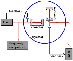 Херрманн и др.[3] 2009 г. Сравниваются частоты пары вращающихся ортогональных оптических резонаторов Фабри-Перо. Частоты двух лазеров Nd:YAG стабилизированы к резонансам этих резонаторов.