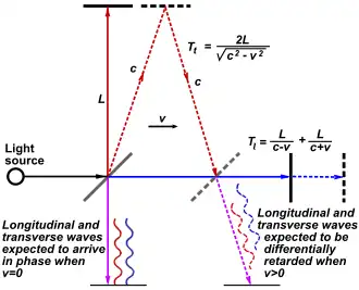 Время прохождения луча в продольном направлении можно определить следующим образом[A 15]: Свет исходит от источника и распространяется со скоростью света в эфире. Он проходит через полупосеребренное зеркало в начале координат при . Отражающее зеркало в этот момент находится на расстоянии (длина плеча интерферометра) и движется со скоростью . Луч попадает в зеркало во время и, таким образом, преодолевает расстояние . В это время зеркало преодолело расстояние . Таким образом и, соответственно, время в пути . То же самое относится и к обратному движению со знаком обращенном вспять, в результате чего и . Общее время в пути составляет: