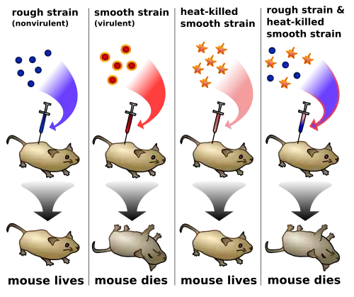 В эксперименте Гриффита, результаты которого были опубликованы в 1928 году[5], было установлено, что какой-то «трансформирующий агент» заставляет пневмококки превращаться из одного штамма в другой. Гриффит, британский офицер, медик, многие годы занимался серологическим типированием пневмонии. Гриффит предполагал, что штаммы, склонные к вирулентности, и невирулентные штаммы превращаются друг в друга (но не предполагал, что разные штаммы могут одновременно заражать один организм). Проверяя данную возможность, Гриффит показал, что трансформация может происходить в случае, когда мышей иммунизировали убитыми бактериям вирулентного штамма и живыми бактериями невирулентного штамма. Позднее из умерших мышей были выделены живые бактерии вирулентного штамма[6]