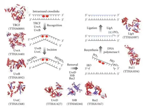 У прокариот эксцизионная репарация нуклеотидов осуществляется системой белков Uvr. Три из этих белков — UvrA, UvrB и UvrC — образуют эндонуклеазу, известную как UvrABC-эндонуклеаза. Сначала белок UvrA распознаёт пиримидиновые димеры и прочие крупные повреждения и связывается с UvrB. Далее UvrA диссоциирует с затратой АТФ, а к UvrB присоединяется UvrC, который вносит надрезы в ДНК по обе стороны от повреждения: с отступом в 7 нуклеотидов от 5'-конца и с отступом в 3—4 нуклеотида от 3'-конца. Внесение надрезов требует затраты АТФ. Далее хеликаза UvrD расплетает ДНК между насечками, благодаря чему повреждённая цепь высвобождается. Синтез новой цепи взамен повреждённой осуществляет ДНК-полимераза I, хотя её могут заменять ДНК-полимеразы II и III. В 99 % случаев при эксцизионной репарации, опосредованной системой Uvr, заменяется фрагмент ДНК длиной около 12 пар оснований (п. о.). В 1 % случаев заменяются более протяжённые участки — длиной около 1500 п. о., а в исключительных случаях и более 9000 п. о. Механизмы, регулирующие длину заменяемого фрагмента (короткий или длинный), неизвестны[3].