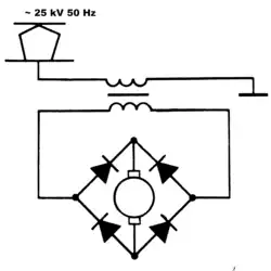 Общая схема электровоза переменного тока. Коллекторные электродвигатели пульсирующего тока подключаются через выпрямитель к вторичной обмотке трансформатора. Если на электровозе несколько электродвигателей (4, 6 и т. д.) — то они подключаются параллельно.