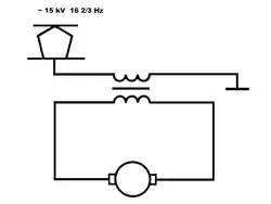 Общая схема старого электровоза переменного тока пониженной частоты. Коллекторные электродвигатели переменного тока подключаются непосредственно к вторичной обмотке трансформатора. Если на электровозе несколько электродвигателей (4, 6 и т. д.) — то они подключаются параллельно.