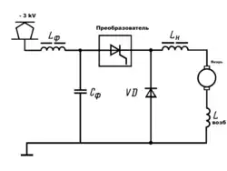 Общая схема электровоза постоянного тока с импульсным регулированием. Преобразователь (в сущности, это электронный ключ, раньше его выполняли по достаточно сложной схеме на быстродействующих тиристорах, в современных конструкциях его роль выполняют IGBT транзисторы) посылает импульсы тока, накопление энергии происходит в дросселе Lн. Фильтр LфCф препятствует проникновению электромагнитных помех в контактную сеть. Обратный диод VD замыкает цепь дросселя Lн и тягового двигателя между импульсами преобразователя, обеспечивая непрерывность тока в них.