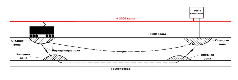 Под колёсами электровоза образуется анодная зона, а на проходящем рядом трубопроводе — катодная зона (левая часть рисунка). Зоны на стыках анодной и катодной зон называются знакопеременными, потенциалы в них могут менять свою полярность. Также анодная и катодная зона образуется вблизи тяговой подстанции (правая часть рисунка). Наиболее интенсивно рельсы корродируют под колёсами электровоза, а подземные сооружения — у тяговых подстанций.