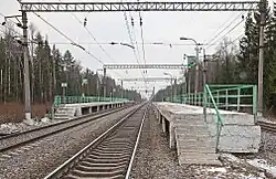 Опоры контактной сети на Московской железной дороге, электрификация на постоянном токе 3 кВ. Над каждым рельсовым путём подвешено по два контактных провода для улучшения токосъёма при высоких токах.