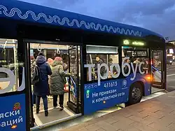 на улицах Санкт-Петербурга. Его ещё называют «автономный троллейбус»Электробусы с подзарядкой в движении внешне и конструктивно похожи на троллейбусы последнего поколения, но оснащаются аккумуляторными батареями большой мощности. Такие машины используют уже имеющуюся оборудованную контактную троллейбусную сеть для зарядки во время движения по электрифицированному участку.