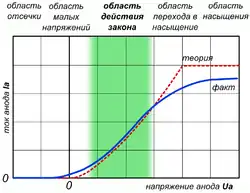 - Участок закона степени трёх вторых. Зависимость анодного тока от напряжения описывается законом степени трёх вторых: где g — постоянная, зависящая от конфигурации и размеров электродов (первеанс). В простейшей модели первеанс не зависит от состава и температуры катода, в действительности растёт с ростом температуры из-за неравномерного нагрева катода.