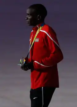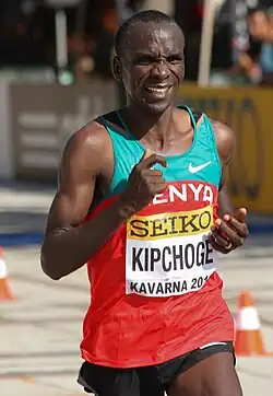Элиуд Кипчоге (англ. Eliud Kipchoge; род. 5 ноября 1984[1], Капсисива, Рифт-Валли) — кенийский бегун-стайер, двукратный олимпийский чемпион в марафоне (2016 и 2020), призёр Олимпийских игр 2004 и 2008 годов на дистанции 5000 метров, чемпион мира 2003 года на дистанции 5000 метров. Второй в истории кениец, выигравший олимпийское золото в марафоне. Экс-рекордсмен мира в марафоне (2:01.09, 25 сентября 2022, Берлин)[3]. За карьеру выиграл рекордные 13 марафонов (включая два олимпийских) из наиболее престижной серии World Marathon Majors.
