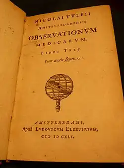 Титульная страница книги профессора Николаса Тульпа под названием Observacionum Medicarum напечатанной Лодевейком Эльзевиром в Амстердаме в 1641 году.