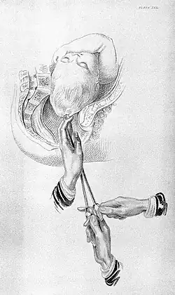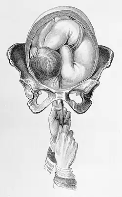 - Извлечение декапитированной части плода при эмбриотомии (головка извлечена) — «The principles and practice of obstetric medicine», с. 178, 1836 г., David Daniel Davis