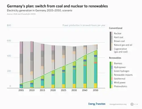 Термин «энергетический переход» также указывает на необходимость политических изменений и часто употребляется в СМИ и публичных дебатах об энергетической политике. Энергопереход предполагает изменение баланса спроса и предложения, переход от централизованной к распределённой генерации (например, производство тепла и электроэнергии в небольших когенерационных установках) для прекращения перепроизводства и избыточного потребления энергии за счёт мер по энергосбережению и повышению энергоэффективности[14]. В более широком смысле энергетический переход может также повлечь за собой демократизацию энергетики[15] и повышение её устойчивости.