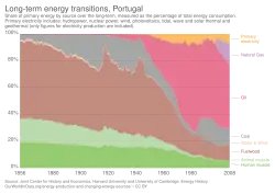 Хронологически первый подход наиболее широко описал Вацлав Смил[24]. Он подчёркивает изменение энергобаланса стран и мировой экономики по отдельным видам первичных источников энергии в процентах от общего объёма энергопотребления. Этот подход описывает изменения в энергосистемах с течением времени, от биомассы к углю, к нефти, а теперь и к комбинации источников, в основном состоящей из угля, нефти и природного газа. До 1950-х годов экономический механизм, лежащий в основе энергетических систем и энергопереходов, был скорее локальным, чем глобальным[25].