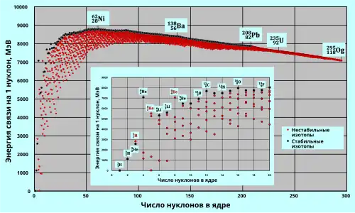 Энергия связи адронов атомного ядра определяется в основном сильным взаимодействие. Для большинства ядер она составляет ~8 МэВ на нуклон.