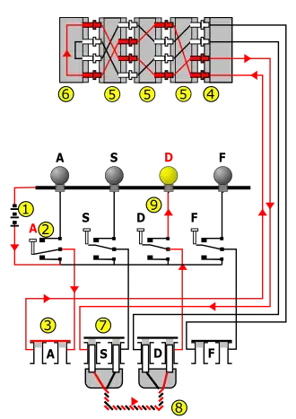 Электрическая схема Энигмы, показывающая, куда течёт ток, когда буква «A» шифруется буквой «D»