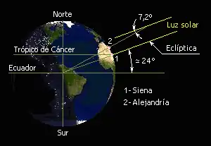 Эратосфен определил угловое расстояние от экватора до тропика: он нашёл его равным 11/83 от 180°.