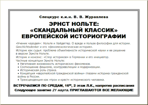 Объявление в Новосибирском государственном университете о курсе лекций, посвящённом творчеству Э. Нольте, 2007 г.