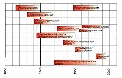 В процессе развития этнологии (культурной и социальной антропологии) и смежных с нею дисциплин возникали различные направления и концепции, некоторые из них к настоящему моменту полностью потеряли своё влияние в науке, другие, наоборот, и сегодня являются актуальными. Концепции некоторых школ и направлений не противоречили друг другу, а рассматривали различные аспекты существования, развития, возникновения этносов, другие же, наоборот, являлись несовместимыми.