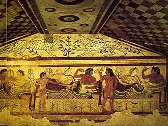 Признанным центром Этрурии являлся город Тарквиния. Название города происходит от сына или брата Тиррена Таркона, основавшего двенадцать этрусских полисов. Некрополи Тарквинии сосредотачивались возле холмов Колле-де-Чивита и Монтероцци. Вырубленные в скале гробницы защищались курганами, камеры расписывались в течение двухсот лет. Именно здесь обнаружили великолепные саркофаги, украшенные барельефами с изображениями усопшего на крышке.