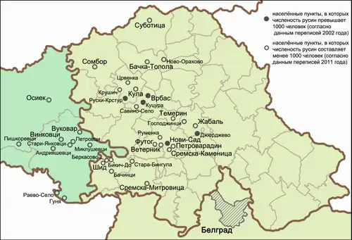 Населённые пункты Сербии и Хорватии, в которых представлено или было в недавнем прошлом представлено русинское национальное меньшинство (по данным переписей в Сербии 2002 года и в Хорватии 2011 года)[29][30][31][32]