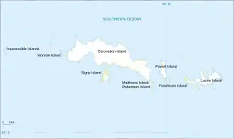 Архипелаг состоит из четырех основных островов, крупнейший из которых остров Коронейшен; его высочайшая точка гора Нивеа (Mount Nivea) достигает отметки 1266 м над уровнем моря. Самый восточный из основных островов — остров Лори (Laurie Island), на котором расположена старейшая постоянно действующая антарктическая станция Оркадас. Еще меньше острова Пауэлл и Сигню. Среди мелких островов можно упомянуть острова Акунья, Ларсен, Робертсон, Саддл и группу Инаксессибл, расположенную в 25 км западнее основной группы.