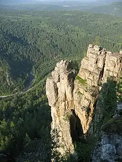 Долина реки Белой отделяет к западу несколько параллельных более высоких и скалистых цепей. Самые высокие хребты Ямантау, Иремель, Зигальга, Машак. Они сложены очень твёрдыми кварцевыми песчаниками и глинистыми сланцами. Для рельефа их очень характерны ступенчатые склоны, широкие нагорные террасы и каменистые вершины. Склоны горных массивов покрыты хвойным лесом до высоты 1100 м, а выше этой линии преобладают каменные россыпи. На нагорных террасах и сопковидных вершинах сохранились стенообразные скалы (останцы), составляющие гребень некоторых гор[1].