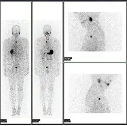 Гамма-излучение в диагностике in vivo улавливается гамма-камерами, метод называется сцинтиграфией. Первоначально использовалась планарная сцинтиграфия, дающая плоскостную проекцию, сейчас набирает популярность однофотонная эмиссионная компьютерная томография (SPECT), работающая уже с трёхмерными моделями[16][18].